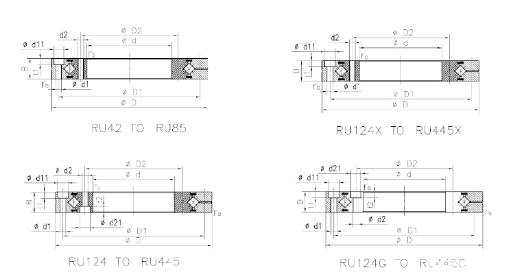 RU交叉滚子轴承具有密封型结构,是在轴承两侧装有特殊橡胶的密封圈,对防尘和润滑脂漏泄具有良好的密封效果。